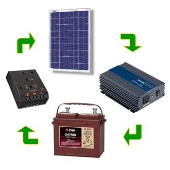 Seleccionar los componentes adecuados de un sistema solar básico de 12V. Sólo hay cuatro elementos a considerar: panel solar, controlador de carga, baterías de ciclo profundo y convertidor DC/AC (ver imagen).